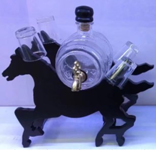 Стъклено буре с 4 чаши и тапа - 0,5 литра. На дървена поставка с форма на кон. 27/27 см в сглобен вид.